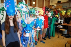 Seit ein paar Wochen werden an der Fritz Schumacher Schule im Kunstraum oben unter dem Dach freche Früchtchen, unheimliche Gestalten, wilde Punks, luftige Feen aus Schaum, Stoff und viel Glitzer gefertigt – eben fantastische Masken und Gestalten für den großen Auftritt auf den Paraden des diesjährigen STAMP Festivals in ALTONA. Gemeinsam mit ihrer Lehrerin Caroline Offermann und kundig unterstützt von der Modedesignerin Susanne Pfeiffer werden die Schülerinnen und Schüler des Jahrgangs 8 (Theater- und Kunst) bei der nächtlichen Parade zur 350 Jahr Feier Altonas mit Gruppen aus aller Welt am Hafen entlang nach Övelgönne tanzen – und auch am Sonntag an der STAMP Parade teilnehmen, die schließlich in einem großen Finale vor dem Altonaer Rathaus enden wird.