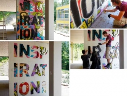 Für das Inversgraffiti konnten die Beteiligten Jugendlichen die Wand erst einmal so gestalten, wie sie es sich vorstellten. Dann wurden Schablonen angebracht: einmal, dass die Schablonen einen Buchstaben bildeten, der sich dann in schwarz vom bunten Untergrund abhebt; und einmal so, dass der bunte Untergrund selbst zu Buchstaben auf einem weißen Hintergrund wurde. Die Ergebnisse können sich sehen lassen!