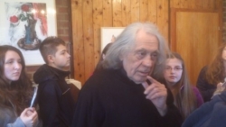 Mit staunenden Augen betrachten die Jugendlichen das Sammelsurium der Gegenstände, Materialien, die zahlreichen an den Wänden und auf dem Boden stehenden Bilder. Sie lauschen den Ausführungen des Künstlers, der in klaren Worten über seine Arbeit und das „Große Welttheater“, das ihn seit Jahrzehnten beschäftigt, spricht. „Es geht immer um das Futter, alle wollen Futter“, erklärt er einem Schüler, Auge in Auge. Dieser nickt. Die klaren Aussagen und Statements beeindrucken die Schüler. Man spürt – Schüler und Künstler sind auf einer Ebene, verstehen sich.