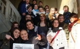 Schülerinnen und Schüler der Lobdeburgschule Jena freuen sich über ihr Kulturagenten-Schild