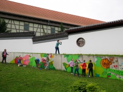 Anknüpfend an das Projekt der letzten 4. Klasse belebten die SchülerInnen unter Anleitung der drei Künstler wie im letzten Jahr auch die neue Tradition der "Schulhof-Wandgestaltung" weiter und setzten das Wandbild fort. Dafür entwarfen sie wieder mit Nora Kühnhausen grafi-sche Elemente, die anschließend von allen SchülerInnen im Workshop mit Sven Messerschmidt farbig auf der großen Schulhofmauer umgesetzt wurden.