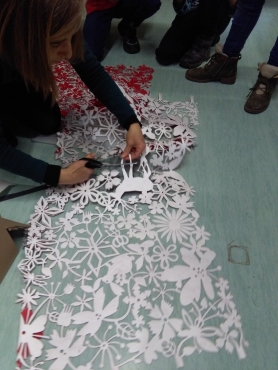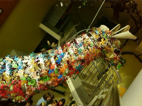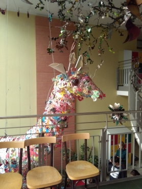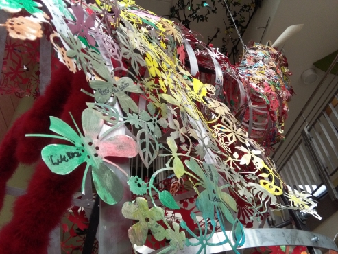 Der Wunsch nach einem Kleid für die Giraffe ROSI zu ihrem ersten Geburtstag wird als Anlass für ein weiteres Projekt mit der Künstlerin Jeannine Cleemen und 30 SchülerInnen der 2. Klassen genommen. Nach den Vorstellungen der Kids wird das Material ausgesucht und in fantasiereichen Formen umgesetzt. Die Künstlerin schuf bereits im Januar 2018 gemeinsam mit ihrem Mann diese wunderbare Symbol-Figur der Giraffe ROSI als Statement für die Gewaltfreie Kommunikation in der Schule.