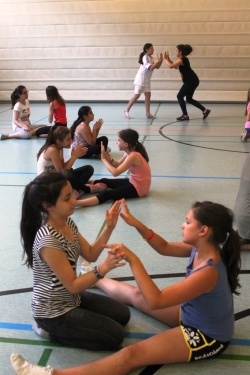 Die Schülerinnen der Klassenstufe 5 wiederum beschäftigten sich tänzerisch mit der Thematik „Sturm und Klang: Pubertät und Erwachsenwerden“. Ausgehend von Alltagsbewegungen entwickelten sie, unterstützt von dem Choreografen Adrian Turner, im Sportunterricht eine Tanzsequenz, die sich mit einem der entstandenen Musikstücke einer anderen beteiligten Schule verband.