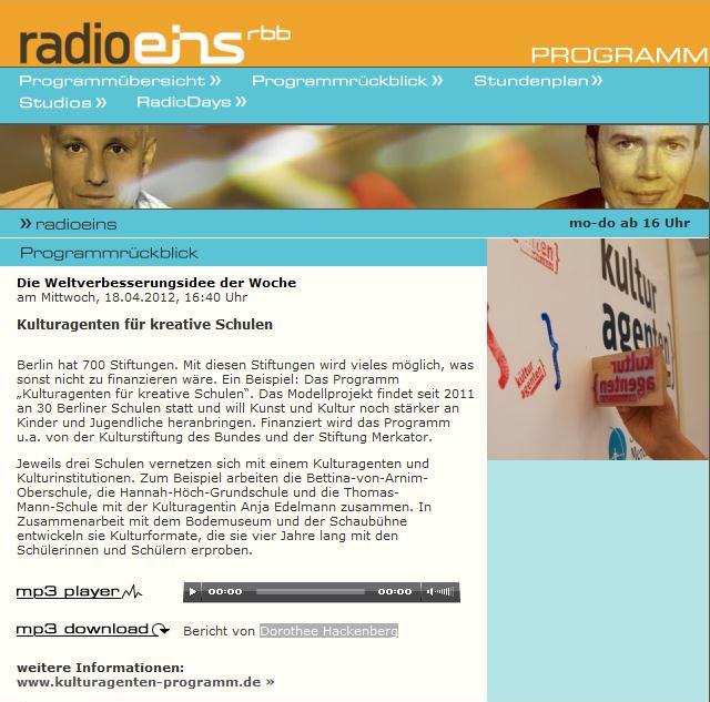 Am 18.04.2012 wurde auf Radio eins das Programm "Kulturagenten für kreative Schulen" vorgestellt. In der Rubrik "Weltverbesserungsidee der Woche" sprach Dorothee Hackenberg mit der Kulturagentin Anja Edelmann sowie drei Lehrerinnen der beteiligten Berliner Kulturagentenschulen über die Arbeit der Kulturagentin, über die Kooperation mit dem Berliner Bode-Museum und der Schaubühne sowie über die künstlerischen Projekte, die die Schulen im Rahmen des Modellprogramms auf die Beine gestellt haben.